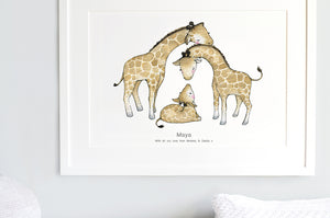 We can also gift wrap your picture in our bespoke animal gift wrap paper (select during checkout), with a striped twine bow, and include a gift message on a silver embossed mouse card gift tag. Choose from two different print sizes, this cute giraffe kid's print is also available unframed or professionally framed in our high quality white wooden picture frame.