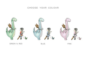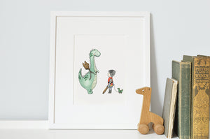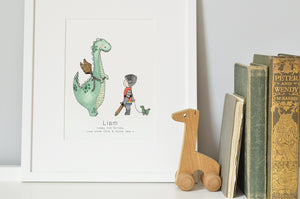 This charming fairy tale illustration of a brave little knight and their dinosaur friend, who dreams of being a dragon, is adventurous, playful and inspiring, perfect for a traditional baby nursery or kid's bedroom wall. Customise this print with a choice of child character, colours and a personalised name and date printed under the artwork for a unique personal children's gift for boy or girl.