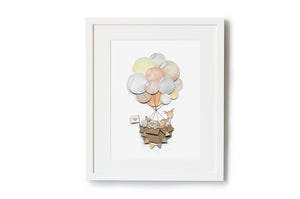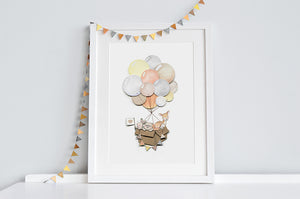 This classic children's balloon picture, featuring forest animals and gender neutral colours, is perfect for a newborn, baby shower or christening gift. Featuring a deer, bear, rabbit and squirrel, the little woodland animal friends are floating in their hot air balloon basket with a big bunch of pastel colour balloons above. This kid's wall art print would be perfect for a unisex baby nursery or child's woodland bedroom, making a beautiful focal art piece above a child's bed, baby cot or nursery changing area.