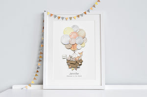 Printed on thick textured paper in the finest pigment inks, this high quality kid's art print has a choice of balloon colours and can have a personalised name and date added printed underneath the illustration to create a unique nursery artwork. Available in two print sizes, with the option to add a white wooden picture frame and gift wrap is available too.