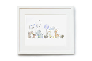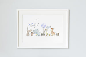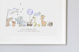 This personalised classic boy's picture of animals on a parade would make a thoughtful gift for a newborn baby boy, birthday, baptism or baby shower. Featuring a baby elephant, bear, rabbit and giraffe marching with music, flags and a drum, this cute kid's celebration illustration can be personalised with a child's name and date.