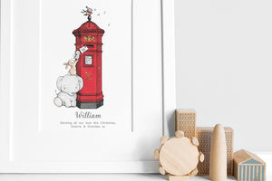Send all your love this Christmas, or celebrate the arrival of a new baby with this bold red British post box illustration and personalise with a name and birth date to create a personal unique newborn gift. Children will love this iconic London picture of a red letter box with a cute watercolour elephant, rabbit and mouse. Choose from two print sizes, and add a textured white picture frame to make this painting a special present for a newborn boy or baby girl.