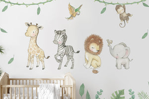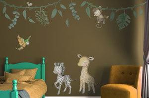 This set of Safari animals children's wall decal stickers are the perfect decoration for a jungle theme child's bedroom or baby's nursery wall. Featuring watercolour paintings of a cute baby elephant, giraffe, zebra, lion, monkey, parrot and botanical foliage, this illustrated kids wall decal sticker set would make the perfect focal decor feature in a children's interior space.