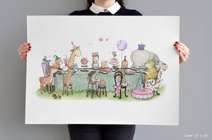 This children's enchanted fairy tale princess tea party picture is perfect for a baby girl's nursery or girl's princess theme bedroom. With a bohemian and eclectic style, this girl's wall art print features Indian and floral prints with a tiger, elephant, giraffe and woodland animals having tea with a princess. Choose from four princess characters and add a personalised name, date or message under the illustration for a unique personal baby girl gift.