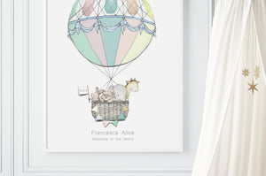 This gender neutral children's hot air balloon picture of a baby elephant, mouse, rabbit and giraffe floating in a big pastel hot air balloon is perfect for decorating a circus theme nursery, bedroom or kid's playroom. Personalise this children's print with a child's name, date of birth underneath the illustration for a unique kid's gift.