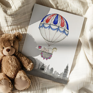A personalised children's London skyline print, depicting a cute elephant, giraffe, bear and bunny enjoying a hot air balloon ride over the city of London. This rather British illustration would look wonderful in a child's London theme nursery, with it’s iconic red, white and blue colour palette. Add a child's name and special date to the iconic London skyline to create a unique personalised newborn baby, christening or kid's birthday gift.