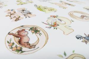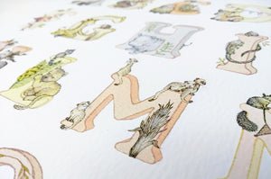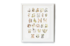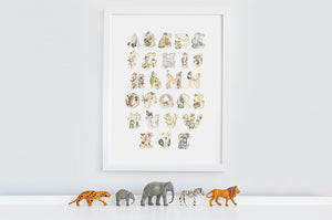 This kid's phonetic alphabet print features the following: Anteater, Baboon, Capybara, Chameleon, Deer, Elephant, Flamingo, Frog, Giraffe, Guinea Pig, Hippo, Iguana, Jaguar, Kudu, Lion, Meerkat, Numbat, Orangutan, Parrot, Quoll, Rhino, Sloth, Tiger, Umbrella bird, Vesper, Warthog, Xenops bird, Yak, Zebra