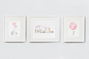 A set of three pink girl's nursery art prints featuring animals on a parade and rose pink balloons, this pretty children's wall art set is perfect for a classic baby girl nursery or traditional kid's bedroom. A thoughtful gift idea for a newborn, Christening, baby shower or a girl's 1st birthday. This classic kid's wall art set is available unframed or framed in white or oak wooden picture frames.