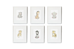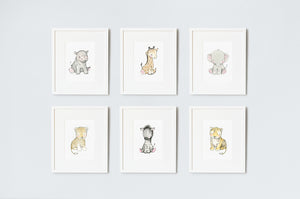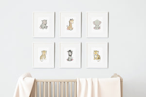Our best-selling and original children's nursery wall art picture set of Safari Newborn baby animal prints, featuring a hippo, giraffe, elephant, lion, zebra and tiger is sure to take a child on a fun safari adventure every day. This set of six children's fine art prints is available unframed or framed in our white or oak wooden frames, and would look beautiful hung above a cot or baby changing table, creating a timeless, neutral and calming children's room.