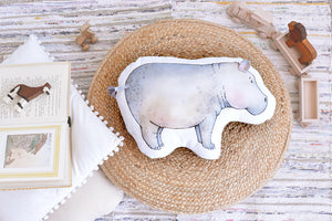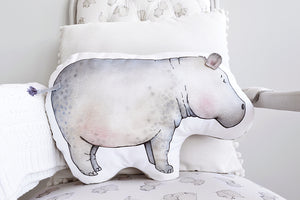 A children's animal shaped hippo cushion, perfect for decorating a baby's gender neutral nursery or kid's safari theme bedroom, he looks great on a nursing chair or child's bed. Handmade in our studio in England to the highest standard, we can gift wrap this cute hippopotamus kid's scatter cushion to make a unique children's gift for a newborn, baby shower or birthday.