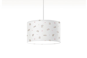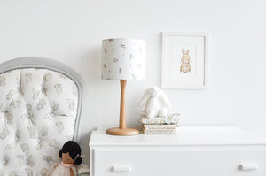 Girl's bunny lampshade, can be used as a baby nursery ceiling light shade or with a children's bedroom lamp. Featuring a cute baby rabbit and floral pink roses print, this children's lampshade is made by hand in England to the highest standard, complying with all safety standards. Choose a 20cm or a 30cm lampshade, both available with a UK European fitting, and we can gift wrap too, for a unique children's gift, perfect for styling a girl's classic nursery or modern room.