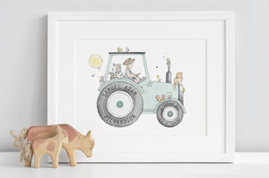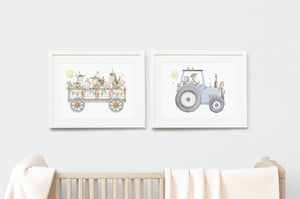 This fun bright children's tractor and cart trailer wall art picture set would be perfect for decorating a kid's bedroom wall, or farm themed baby's nursery interior. Personalise the tractor wheels with a child's name and birth details, customise the child character, and choose from 11 different tractor and cart wheel colours to create a truly unique artwork piece!