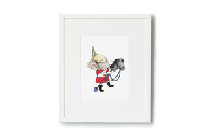 A children's print of an adorable mouse cavalry guard wearing his traditional British military red uniform, and proudly riding atop his hobby horse through his favourite capital city, London. This classic kid's bedroom artwork would be a wonderful, unique gift for a newborn baby boy, christening, or birthday. Add a British-made white wood textured picture frame for a modern finish fit for royalty!