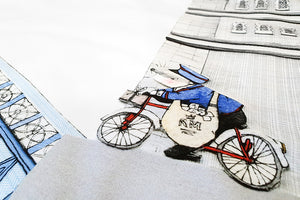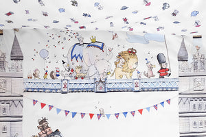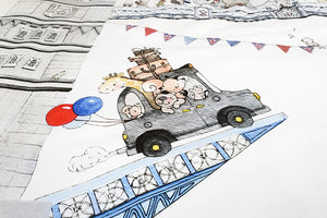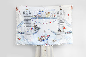 This children's play mat, featuring Daisy & Bump's London Tower Bridge Illustration is perfect for a baby's British theme nursery, boy's bedroom or kid's playroom decor. Handmade with 100% cotton in our studio, with pom pom trim, this British made large child's playmat is like a big soft nursery rug, adding style to your child's floor, but also providing a perfect soft space for baby's tummy time, or for a child to comfortably play and read. With cute watercolour animals riding in boats, bikes and a London black cab over this big Tower bridge playmat, there are so many fun details to spark your child's imagination, and would make a truly unique children's gift.