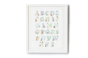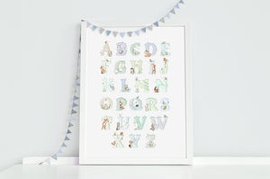 This children’s alphabet picture features letters entwined with cute woodland animals including a deer, fox, rabbit and bear. An educational, fun kid’s picture, with pastel blue and green lettering, perfect for a hanging in reading nook corner, above a cot, or changing area in a boy's nursery.