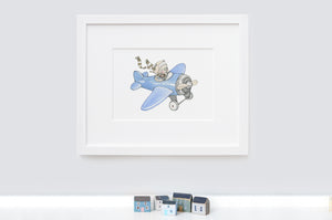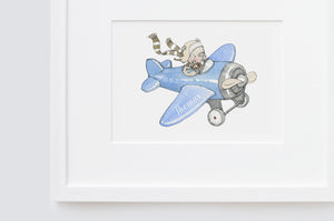 This classic children's illustrated print of a blue airplane would make the perfect gift for a newborn baby boy, child's christening, boy's first birthday or baby shower. Join this cute bear and mouse as they fly in their traditional pastel blue plane, printed on thick fine art archival paper, this illustration is available unframed or framed in a white or oak wooden picture frame. Personalise with a baby boy's name, date of birth to create a unique personal newborn baby boy gift.