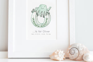 A cute personalised children’s nautical letter print, featuring the initial of a child’s name entwined with ocean themed illustrations, this custom kid’s print would make a thoughtful gift for a newborn, baby shower, naming ceremony or christening gift. From A-Z, choose the first letter of a new baby’s name to create your own, one-of-a-kind bespoke kid’s artwork, and we can also print additional personalised details underneath the illustrated letter too.