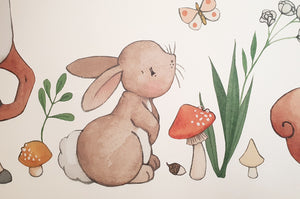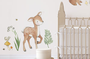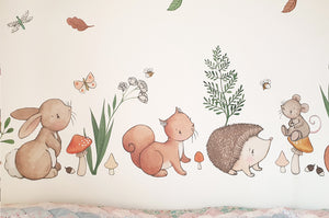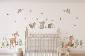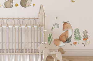 This set of woodland animals children's wall decal stickers are the perfect decoration for a forest theme child's bedroom or baby's nursery wall. Featuring watercolour paintings of a cute deer, fox, bunny rabbit, squirrel, hedgehog, birds and forest foliage, this illustrated kids wall decal sticker set would make the perfect focal decor feature in a children's interior space.
