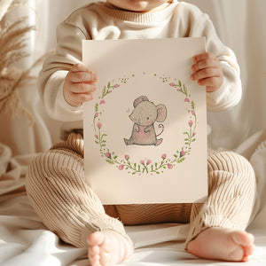 This cute floral mouse girl's nursery print features a floral wreath of watercolour flowers in soft pastel pink shades to suit a girl's bedroom interior. The option to personalise this picture with a child's name, date of birth or special message makes this artwork an ideal baby shower present or newborn girl gift. Available in many different print sizes, with the option to add a white or oak wooden picture frame so that the illustration is ready to hang on a nursery or playroom wall.