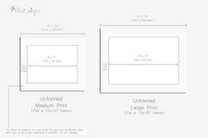 Sizes - All options come with an acid free textured mount. Unframed prints are presented flat in a cellophane sleeve with a backing board. See size chart in product photos of visit our FAQ page for more helpful info on sizing & framing.