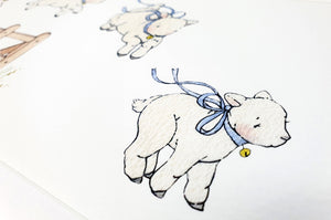 Our team carefully stitches and adds 3D collaged paper flags to some of our prints. An intricate yet valuable stage in our process to not only replicate Jessica’s characterful original illustrations, but to bring your child unique details that spark their imagination. All our prints can be personalised with a baby's name, date or special message, and many prints also have colour and character customisation options too. Allowing you to create a truley unique and personal children's gift.