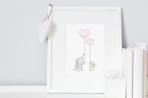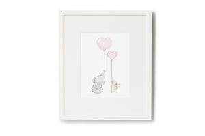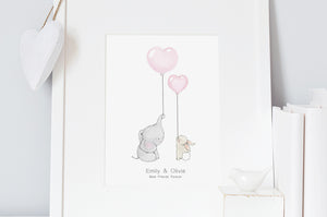 A perfect personal gift for a newborn, baby shower, christening or best friend, this cute children's picture of a grey elephant and his best bunny friend holding two blush pink heart shaped balloons is printed to the highest quality. Personalise this kid's print with a name and date of birth under the illustrated animals to create a bespoke thoughtful present for a baby girl.