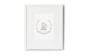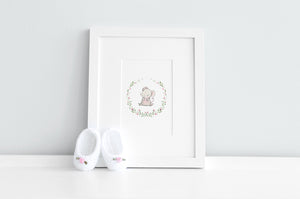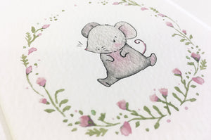 This cute floral mouse girl's nursery print features a floral wreath of watercolour flowers in soft pastel pink shades to suit a girl's bedroom interior. The option to personalise this picture with a child's name, date of birth or special message makes this artwork an ideal baby shower present or newborn girl gift. Available in three different print sizes, with the options to add a white wooden picture frame so that the illustration is ready to hang on a nursery or playroom wall.