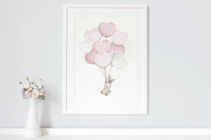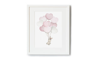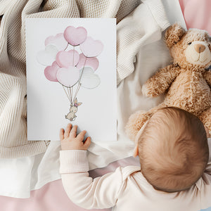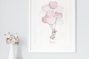 This pretty pink children's balloon picture of a bunny rabbit floating with a bunch of pastel pink heart shaped balloons would be a perfect gift for a newborn girl, baby shower, or first birthday gift. Personalise this children's print with a choice of animal character, and a child's name and date of birth printed underneath the illustration for a unique kid's picture.