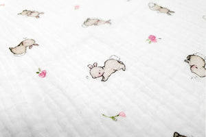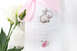 About: This super soft bunny muslin cloth for baby girl, is printed with cute rabbits and pretty floral pink roses. An essential baby item, this absorbent 100% cotton muslin square is gentle on baby's skin, and handmade in our UK studio, making it a useful and beautiful gift for a newborn baby girl, baby shower or child's christening present.