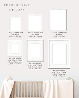 Printed with pigment inks onto thick textured archival paper, this children's giclee art print can be framed in a wood frame (available in Oak or with a white paint finish). Professionally tape sealed back, with picture cord attached and safety perspex, our frames arrive ready to hang! Please see the product photos for all the frame sizes and options.