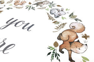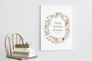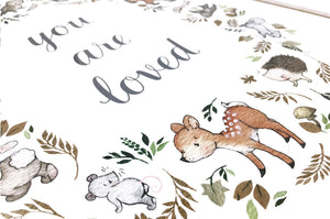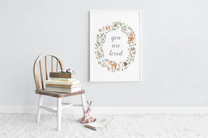 A children's inspirational quote wreath picture, with deer, rabbits, a fox and many more forest animals, this big kid's poster print is perfect for a gender neutral baby nursery or woodland theme child's bedroom. Available with the printed quote "you are loved" or alternatively, personalise this print with a child's name, date or special message in the centre of the wreath to create a unique baby gift.