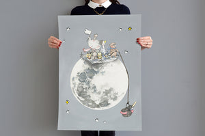 A big children's moon theme bedroom wall picture, perfect for a baby boy, baby girl or gender neutral nursery. This kid's poster print of an elephant, rabbit and friends enjoying a picnic party on the moon is available in three big unframed print sizes, with the option to add a white picture frame. Yellow and white stars complement the soft grey background, for a unisex space adventure themed children's artwork.