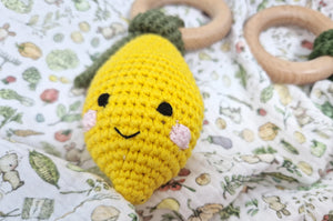 About - This cute crochet lemon wooden rattle teether would make the perfect gift for a baby boy or girl. Perfect for baby to bite when teething and shake for a fun rattle noise. Made with all natural materials: untreated 100% FSC certified maple wood ring, wrapped in 100% cotton yarn and stuffed with biodegradable corn fibers.