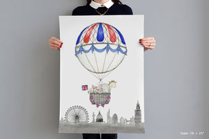 An iconic personalisable kid's poster print of the London skyline, perfect for a baby boy or baby girl's British themed nursery. A cute giraffe, elephant, bear and rabbit take a fun hot air balloon ride above the capital city London in this bold red and blue children's balloon picture. Made and illustrated in England, this children's bedroom artwork is printed with pigment inks on thick high quality paper and comes in many print sizes, with the option to add a white or oak wooden picture frame.
