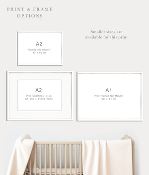 Printed with pigment inks onto thick textured archival paper, this children's giclee art print can be framed in a wood frame (available in Oak or with a white paint finish). Professionally tape sealed back, with picture cord attached and safety perspex, our frames arrive ready to hang! Please see the product photos for all the print size and frame options.
