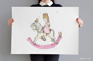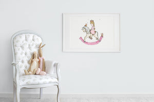 A classic girl's nursery wall art picture of a traditional pink rocking horse, perfect for hanging above a baby girl's cot, bed or changing table for a statement focal art decor piece. A unique and customisable gift for a newborn little girl, this beautiful painting of a princess riding a pink rocking horse can be framed in our Daisy & Bump wooden white picture framing, with a personalised name and date printed under the illustration.
