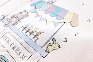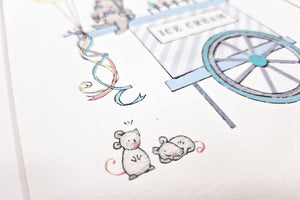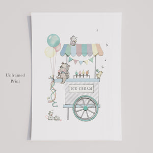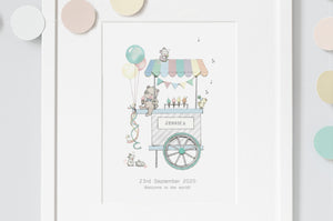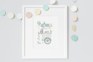 This unique personalised children's picture of an ice cream cart would make a unique kid's gift, with a personalised child's name, date or message printed underneath the illustration. A pretty pastel colour palette makes this wonderful unisex kid's artwork suitable for a baby boy, baby girl or gender neutral circus theme interior design.