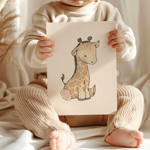 This cute children's giraffe painting can be customised with a printed baby’s name and birthday to create a thoughtful personal gift for a baby or toddler. This pastel yellow African giraffe animal print is perfect for a Safari theme nursery or gender neutral child's bedroom.