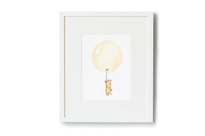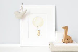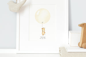 This children's print of a cute illustrated baby giraffe holding onto a soft pastel yellow balloon is a great nursery wall decor idea for a gender neutral bedroom design. Customise the print with your choice of balloon colour and animal character from the drop-down menus to make it a unique baby gift, and add a name and birthdate to create a special personalised present that will be treasured by parent and child.