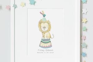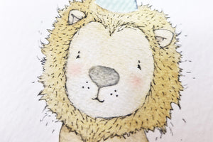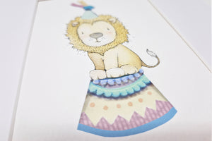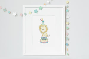 A bright children's circus theme nursery picture of a cute lion illustration, perfect for a new baby, birthday or christening gift. This kid's art print of an original illustration is ideal for a children's circus theme bedroom or baby nursery. Printed on high quality archival paper, this proud watercolour circus lion with his yellow and mint party hat, is having enjoying his new found fame at the animal fair.