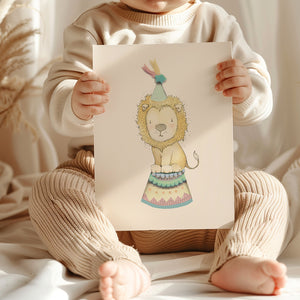 A bright children's circus theme nursery picture of a cute lion illustration, perfect for a new baby, birthday or christening gift. This kid's art print of an original illustration is ideal for a children's circus theme bedroom or baby nursery. Printed on high quality archival paper, this proud watercolour circus lion with his yellow and mint party hat, is having enjoying his new found fame at the animal fair.