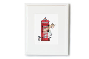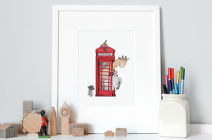 Celebrate the arrival of a new baby with this bold red British telephone box illustration and personalise with a name and birth date to create a personal unique newborn gift. Children will love this iconic London picture of a red phone booth with a cute watercolour elephant, giraffe and mouse. Choose from two print sizes, and add a textured white picture frame to make this painting a special present for a newborn boy or baby girl.