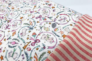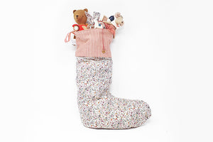 This large children's personalised Christmas stocking features a traditional unique festive mouse print, with striped cotton top. Handmade in England from 100% cotton, this luxury kid's stocking is fully lined, ready for Santa to fill with Christmas gifts for baby or child this Christmas Eve. Add a customised leather gift tag, personalised with gold hot foil letter pressed kid's name and 'From Santa X' (optional), the tag will be attached with a hand sewn red velvet bow to your child's Christmas stocking for that extra special and magical finish.