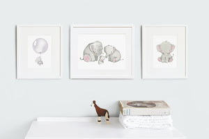 A set of three elephant nursery artwork pictures in a modern yet timeless grey colour scheme, these pictures feature a newborn baby elephant, a Mummy and Daddy elephant, and a cute elephant holding onto a grey balloon. Ideal for decorating the wall above a cot, these delightful images have been lovingly illustrated using watercolour and reproduced on a gorgeous textured archival paper using pigment inks.